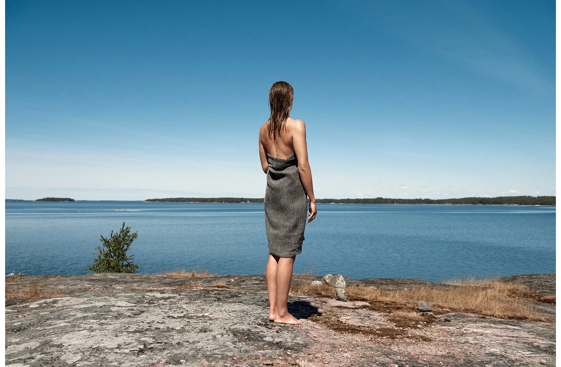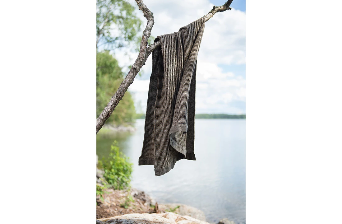Nieuw kleur! Comfortabele handdoek met chambray randen. Kenno saunatextiel is gemaakt van gerecycled katoen, waardoor de stof een natuurlijke zachtheid en levendige textuur krijgt.
