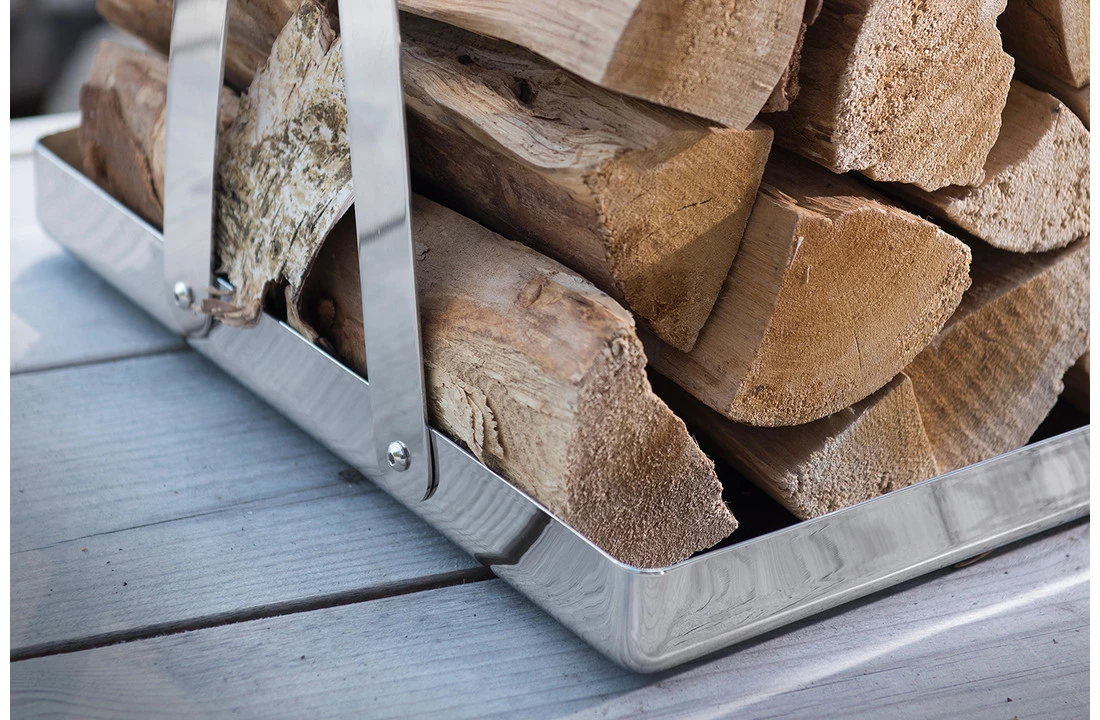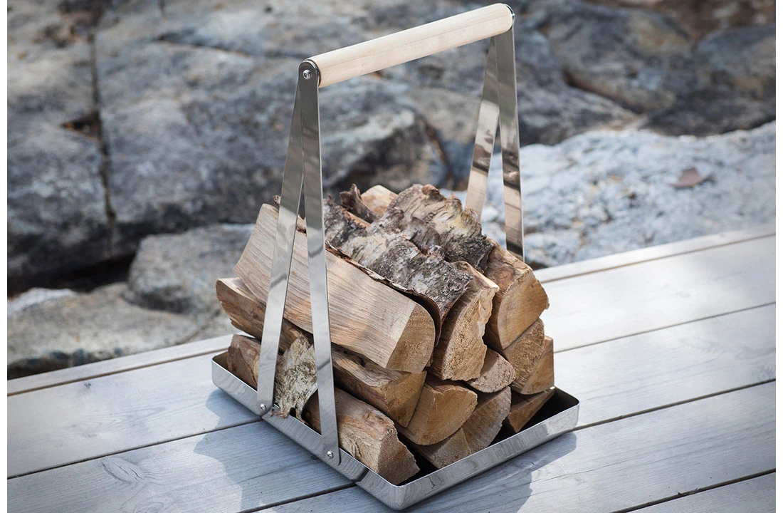 Het brandhout rek is speciaal ontworpen door Harri Koskinen. Het brandhoutrek is speciaal gemaakt van glanzend staal en het handvat is van berken. De samenwerkingscollectie met H. Koskinen heeft een stijlvol en eenvoudig ontwerp.