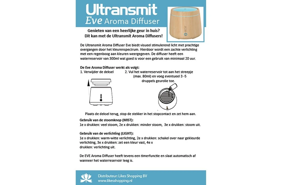 De Ultransmit Aroma Diffuser Eve is zeer geschikt voor het verdampen van essentiële oliën. Het water in de Aroma Diffuser wordt door middel van trillingen met een hoge frequentie omgezet in stoom, waardoor een koude verneveling ontstaat. De Aroma Diffuser is hierdoor uitstekend geschikt om in huis, kantoor-, salon- en praktijkruimte te gebruiken. De Aroma Diffuser heeft een fraaie verlichting. De kleuren van de verlichting lopen op een rustgevende manier in elkaar over, maar kan ook op één kleur vastgezet of helemaal uitgezet worden. Â
