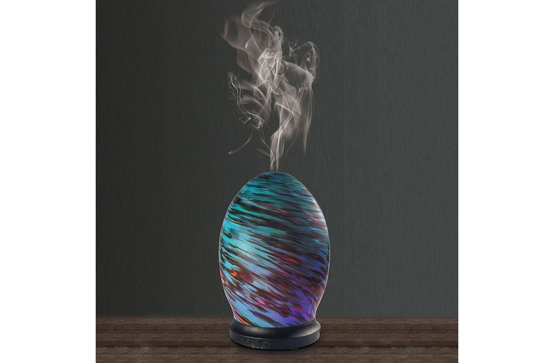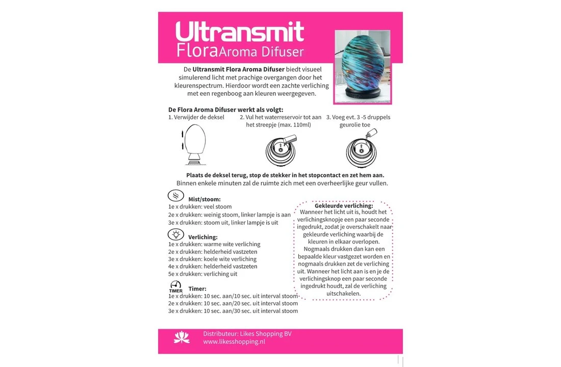 De Ultransmit Aroma Diffuser is zeer geschikt voor het verdampen van essentiële oliën. Het water in de Aroma Diffuser wordt door middel van trillingen met een hoge frequentie omgezet in stoom, waardoor een koude verneveling ontstaat. De Aroma Diffuser is hierdoor uitstekend geschikt om in huis, kantoor-, salon- en praktijkruimte te gebruiken. De Aroma Diffuser Flora is voorzien van een mooi glazen kap met verschillende soorten blauwe tinten in verwerkt zijn. De Aroma Diffuser heeft een fraaie verlichting. De kleuren van de verlichting lopen op een rustgevende manier in elkaar over, maar kan ook op één kleur vastgezet of helemaal uitgezet worden.